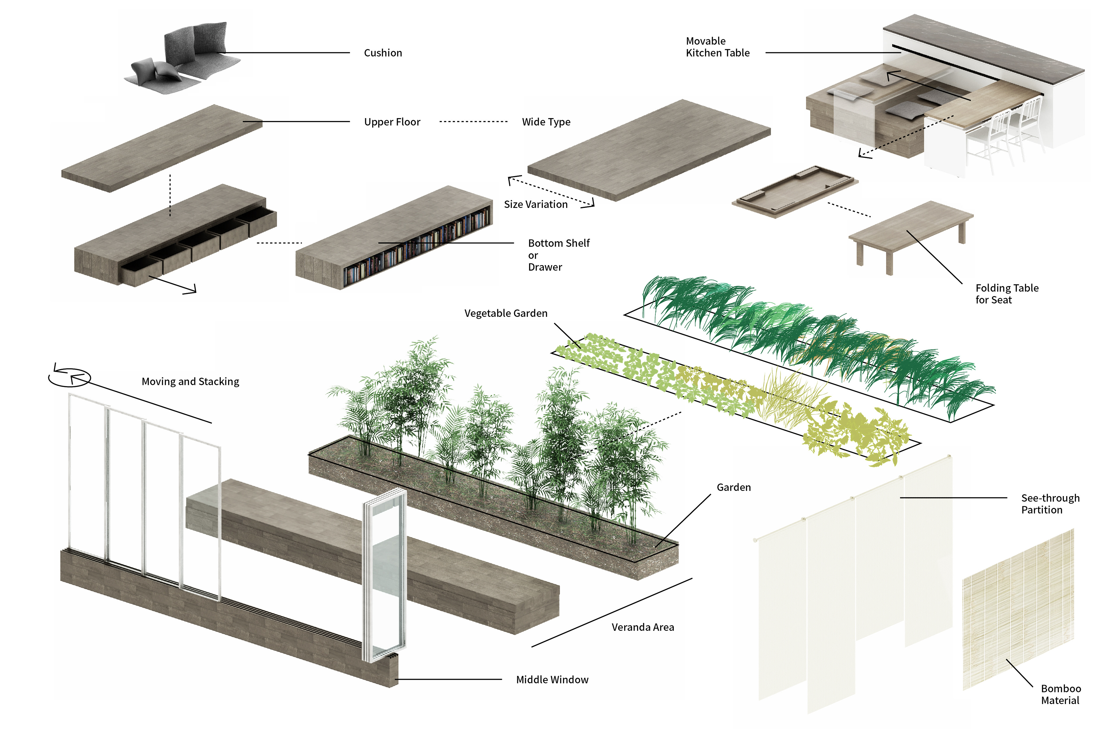 HYPER-ORDINARY is a new average core space that adopts contemporary needs within the traditional concept. This place sees the living room and the kitchen as the central areas for the family to recover life and where new values are created. This is not an entirely new space. It is a realistic yet ideal space that seeks to re-interpret the traditional concept lost due to rapid westernisation, that represents contemporary family life and that pursues a sustainable future.